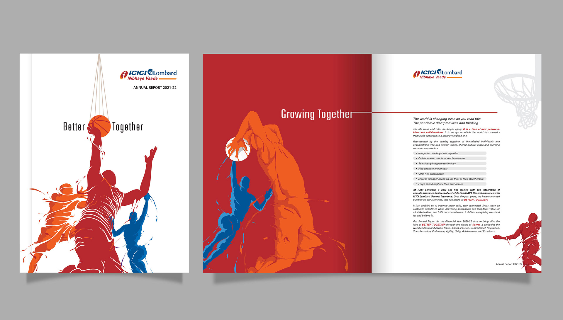 For this report, I capitalized on ICICI’s brand colors: the vibrant orange, rich maroon, and deep blue. These colors were employed boldly, drawing a direct parallel to the energy of the sports visuals and resonating with the combined vigor of the merged entities.
